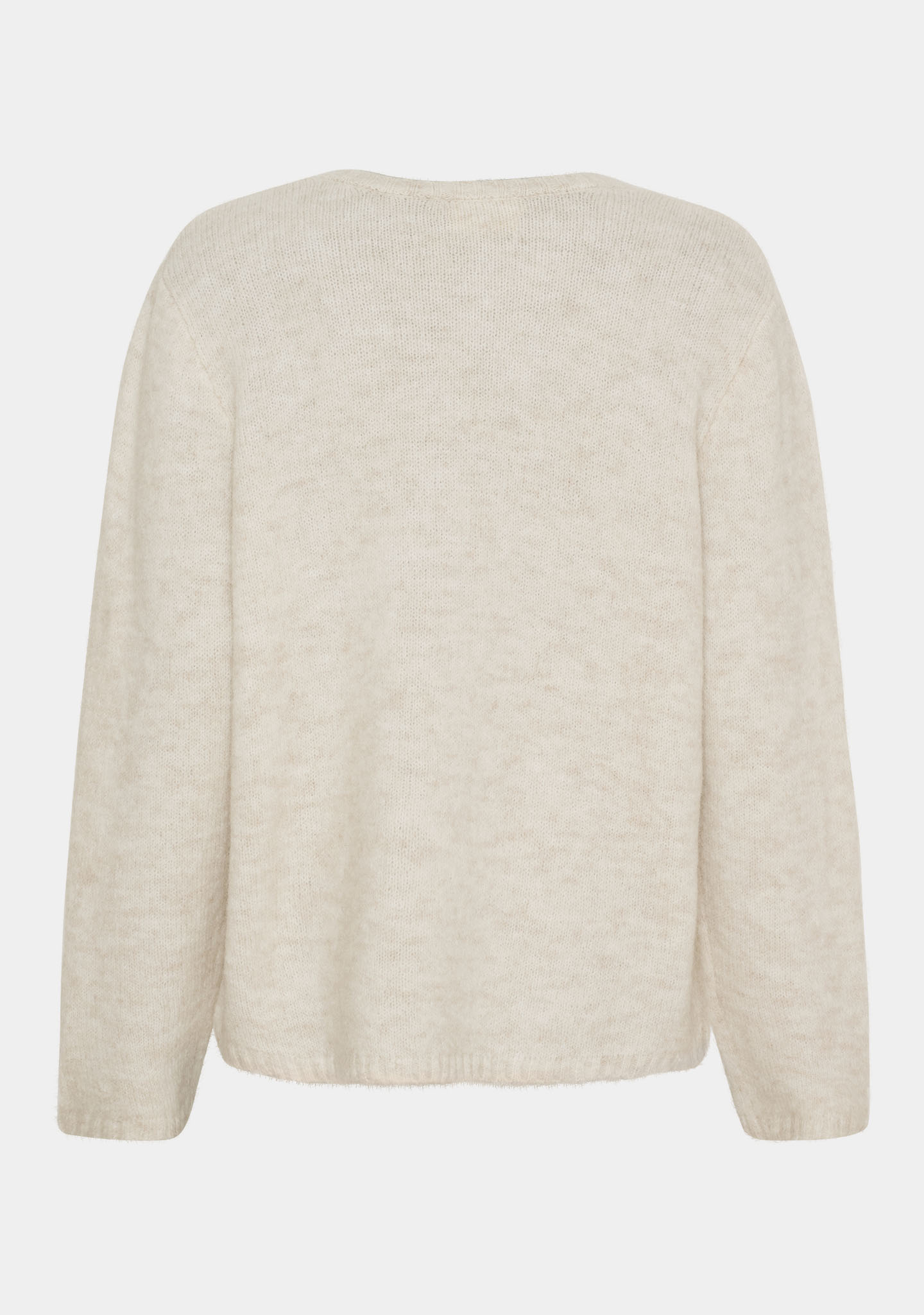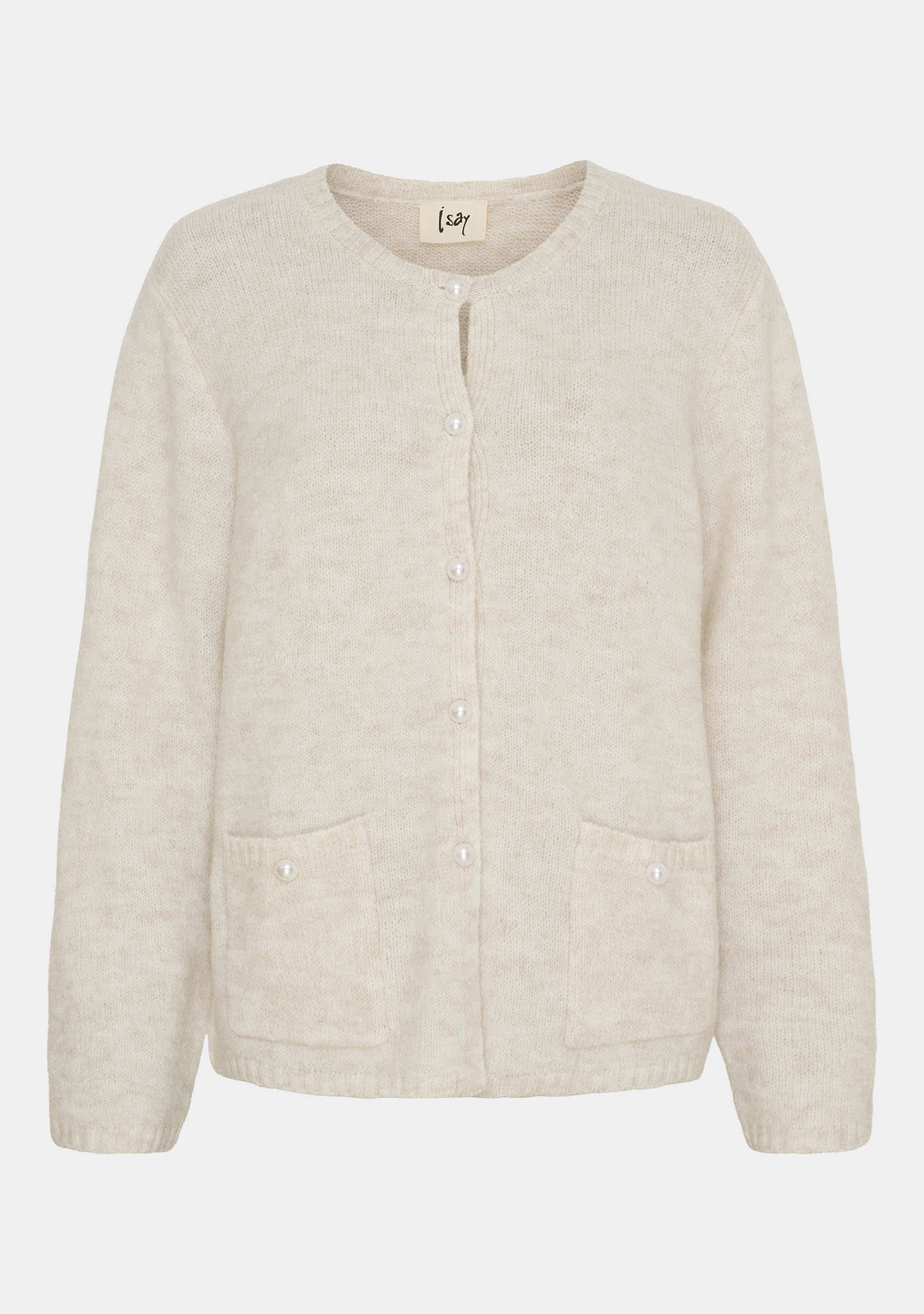 Cardiganen har en rund hals og gennemgående knapper foran, som giver et enkelt og elegant look. Forlommerne tilføjer en praktisk og hyggelig detalje.