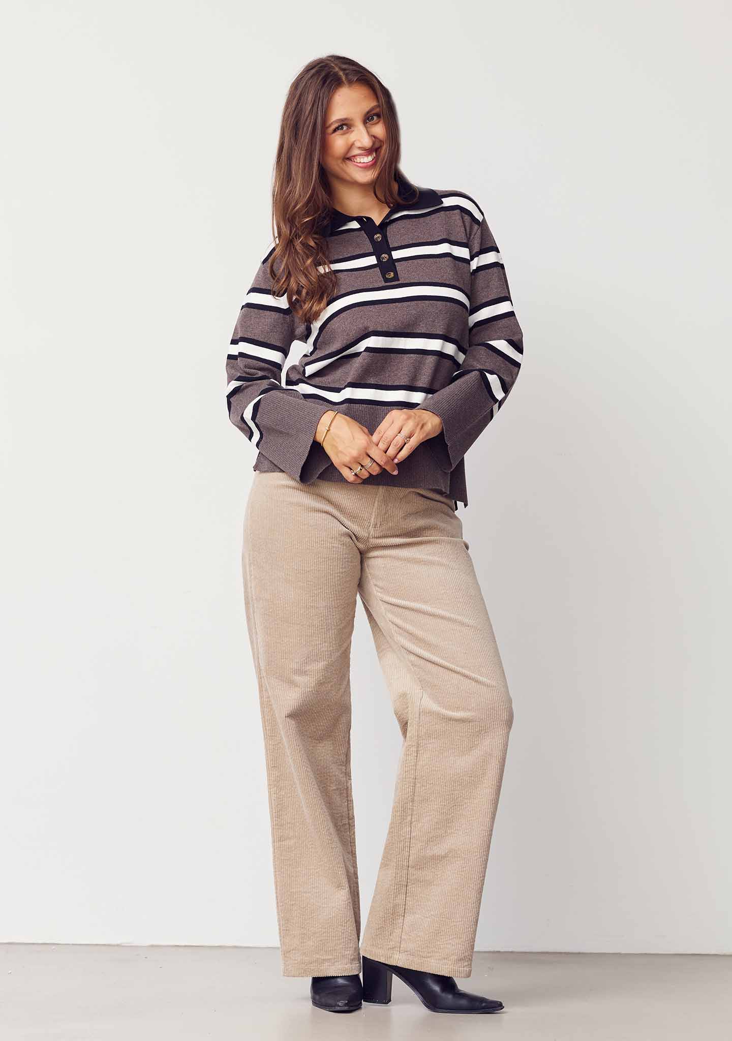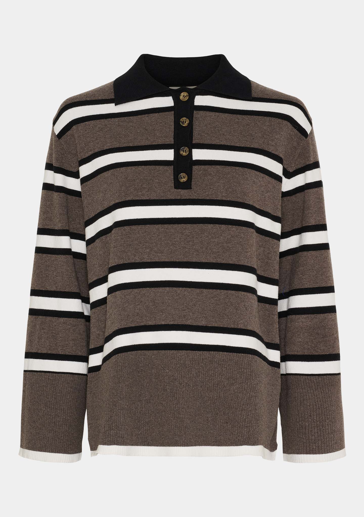 Frigga Polo Pullover kombinerer et sporty design med feminine detaljer. Den klassiske polokrave og knaplukningen foran skaber et tidløst udtryk, mens de løse lange ærmer tilfører en afslappet og behagelig pasform.
