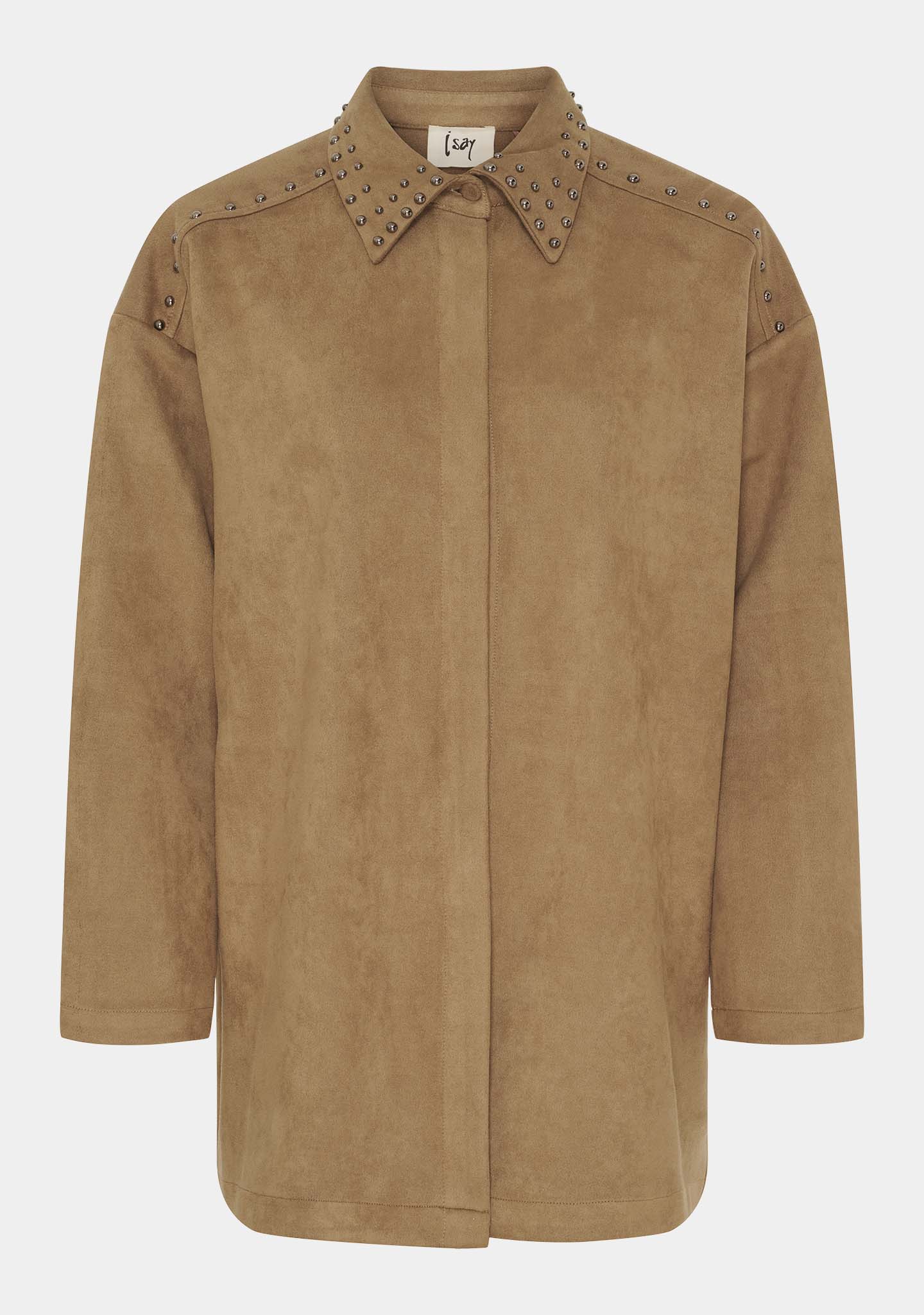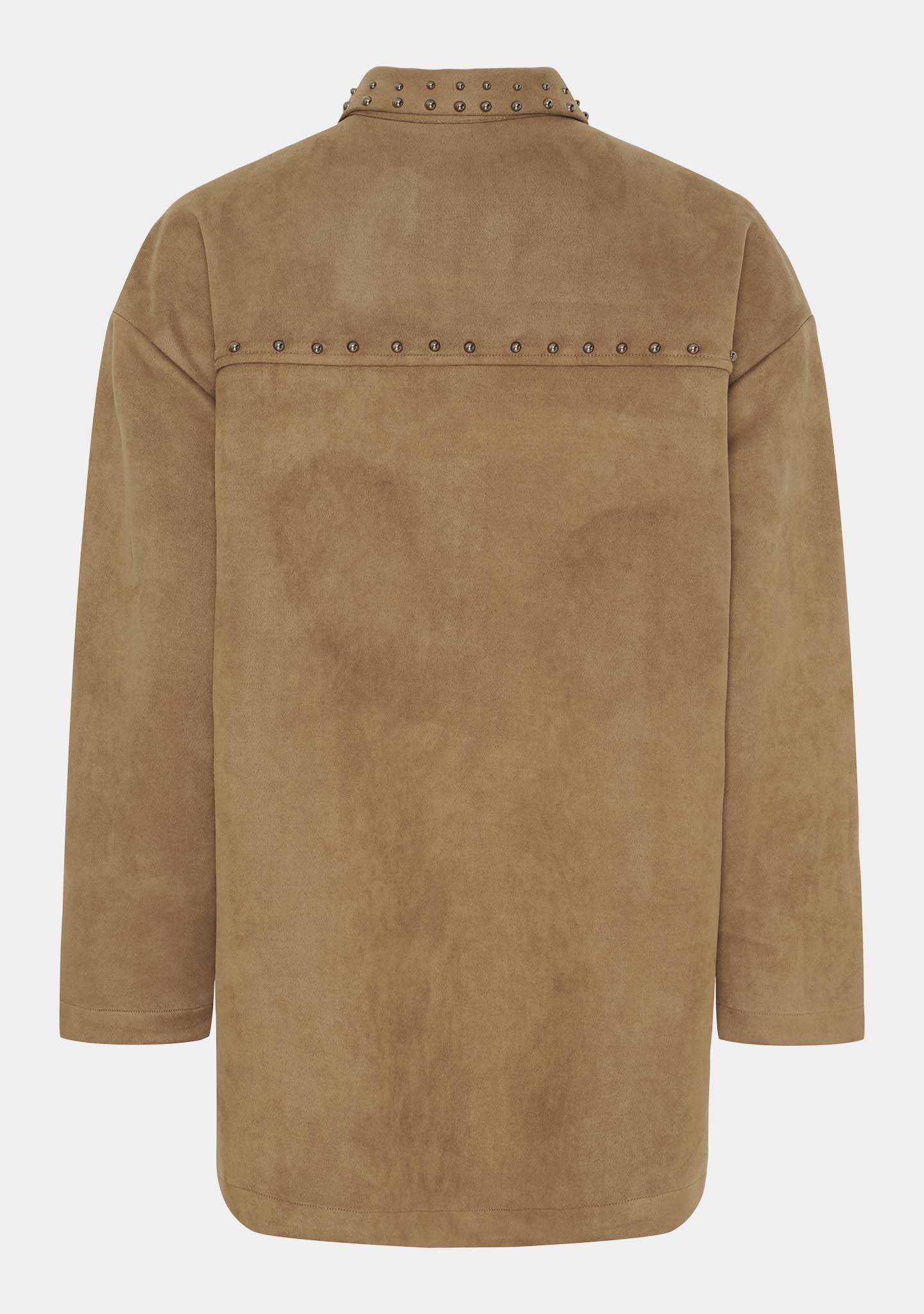 Denne skjortejakke kombinerer klassisk design med et moderne twist. Den bløde ruskindslignende kvalitet med stretch giver en komfortabel pasform og et stilfuldt look. De dekorative nitter på krave og skuldre skaber et råt, men elegant udtryk, som giver jakken et unikt præg.