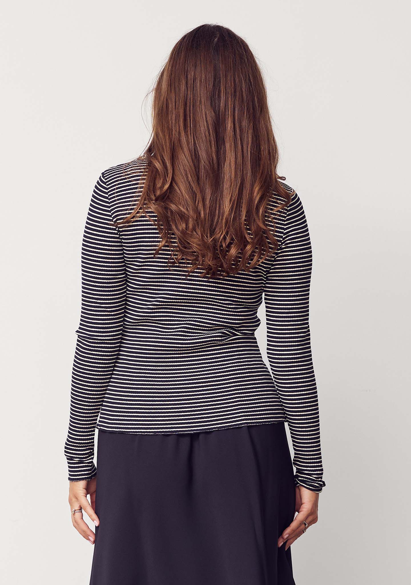 Den bløde bomuldsrib med elastan sikrer stræk og høj komfort, hvilket gør blusen ideel til hverdagsbrug – enten alene eller som et lag under strik og blazere.