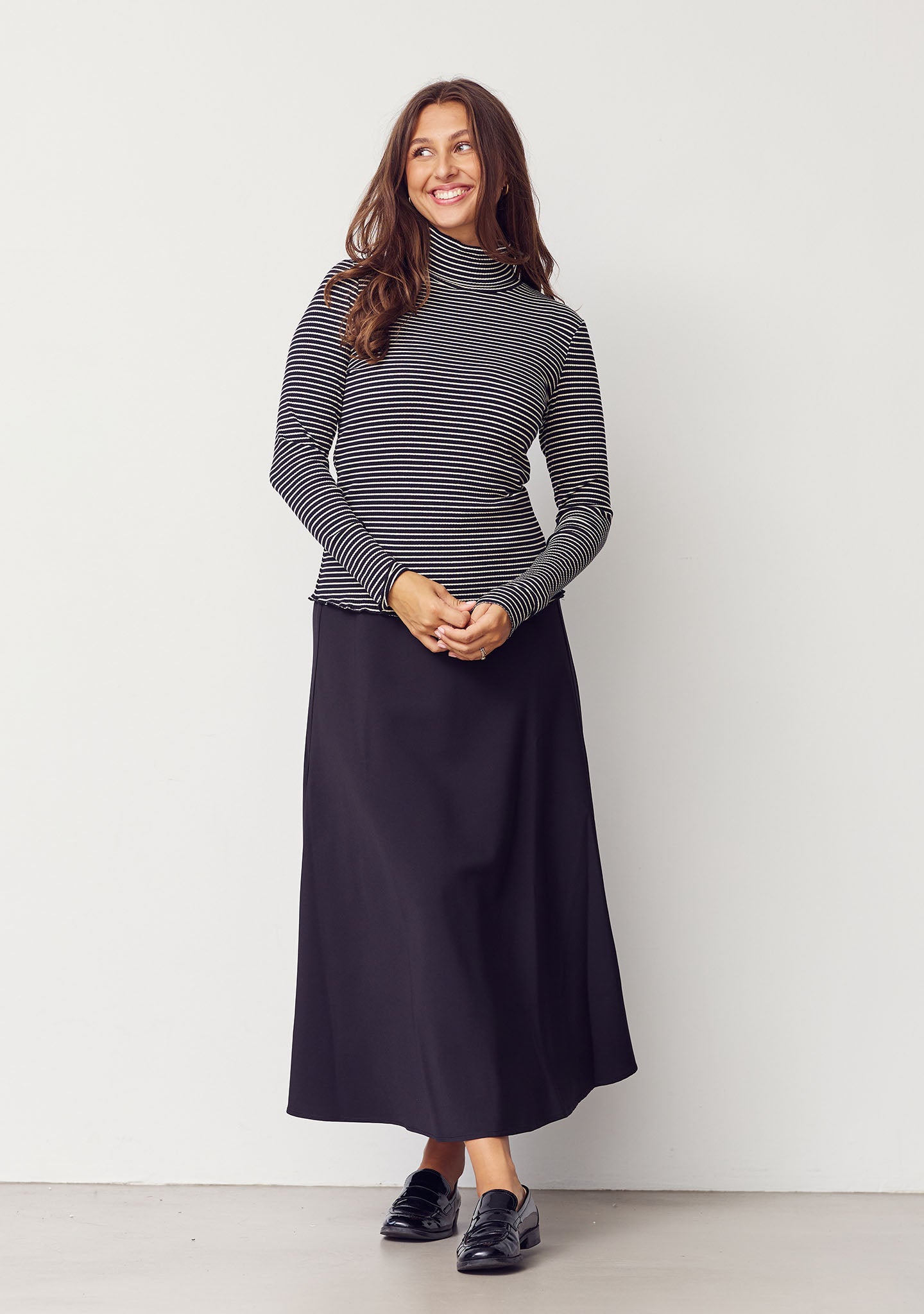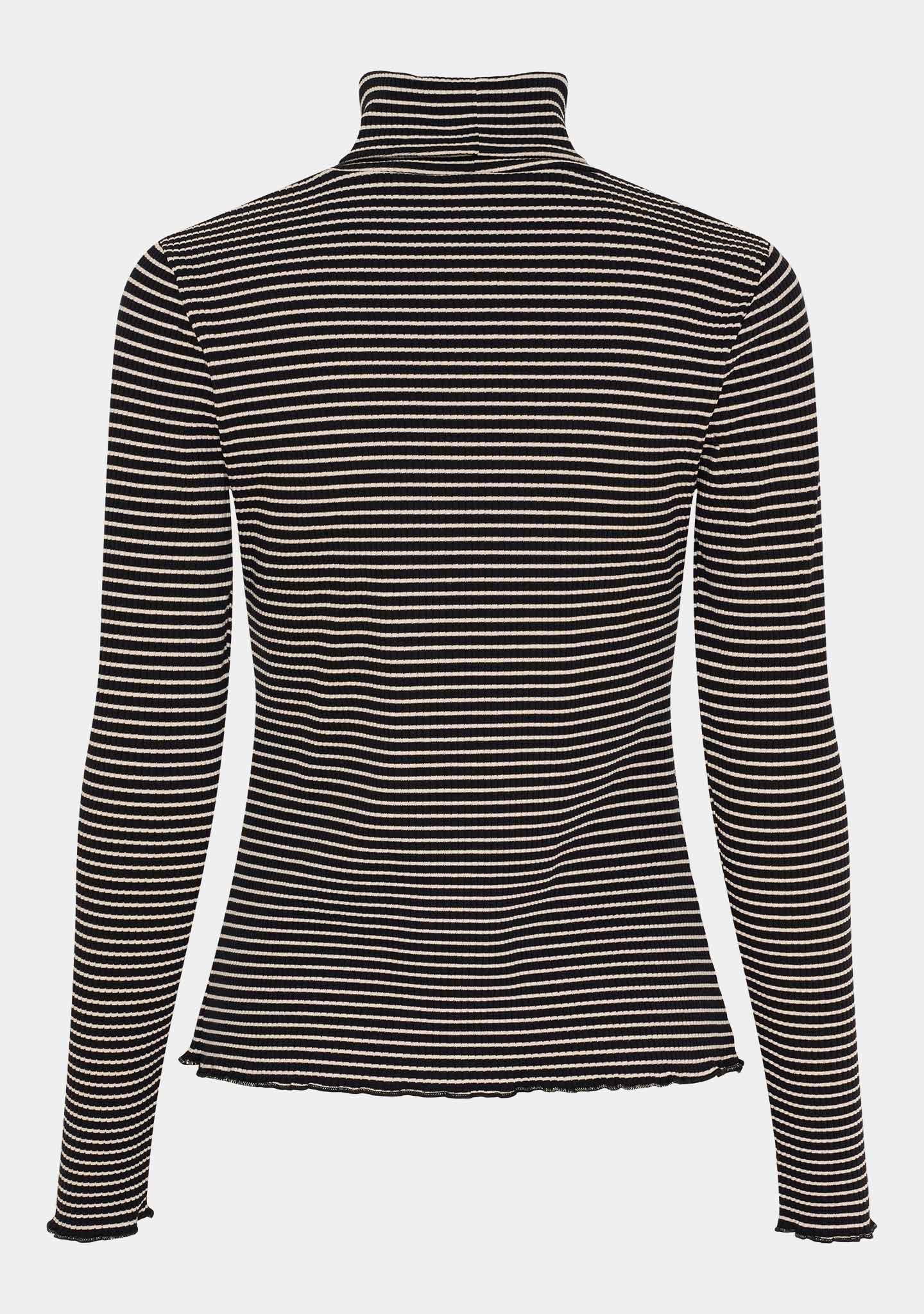 Karla Rollneck Blouse er en tidløs basisbluse, der kombinerer komfort med et elegant udtryk. Den tætsiddende pasform og rullekraven giver et klassisk look, mens den bølgede kantafslutning ved ærmer og bund tilføjer en feminin detalje.