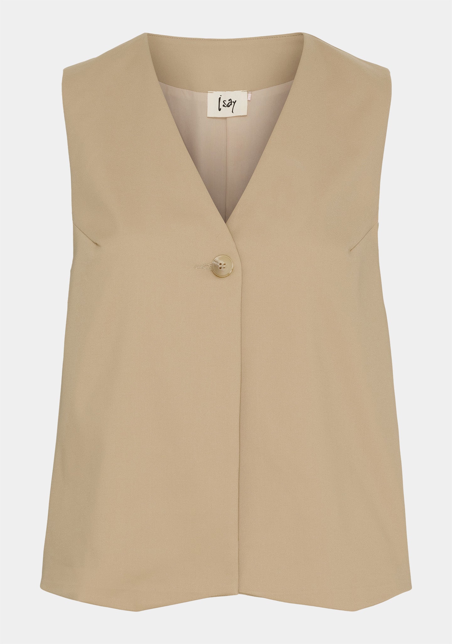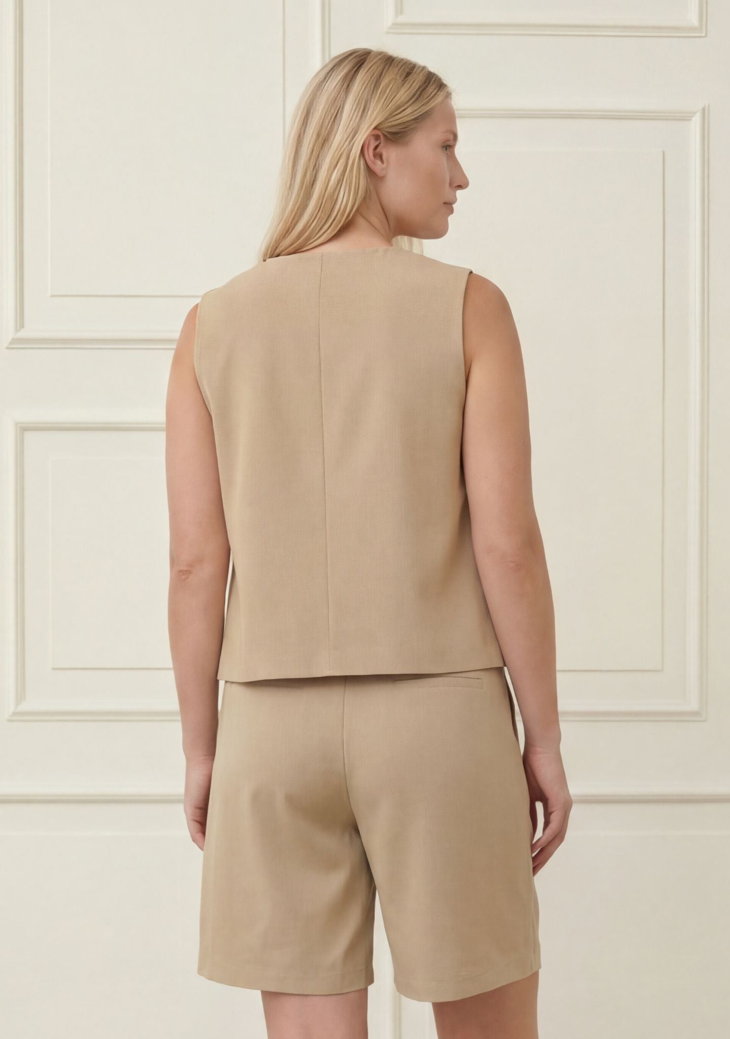 Majse Waistcoat er den slags vest, der giver form og ro på samme tid. Den er let taljeret og markerer blidt taljen uden at stramme. De diskrete, formgivende syninger ved armene skaber en smuk linje og giver vesten facon, så den falder pænt og feminint. V-udskæringen og den enkle knaplukning holder udtrykket rent og klassisk.