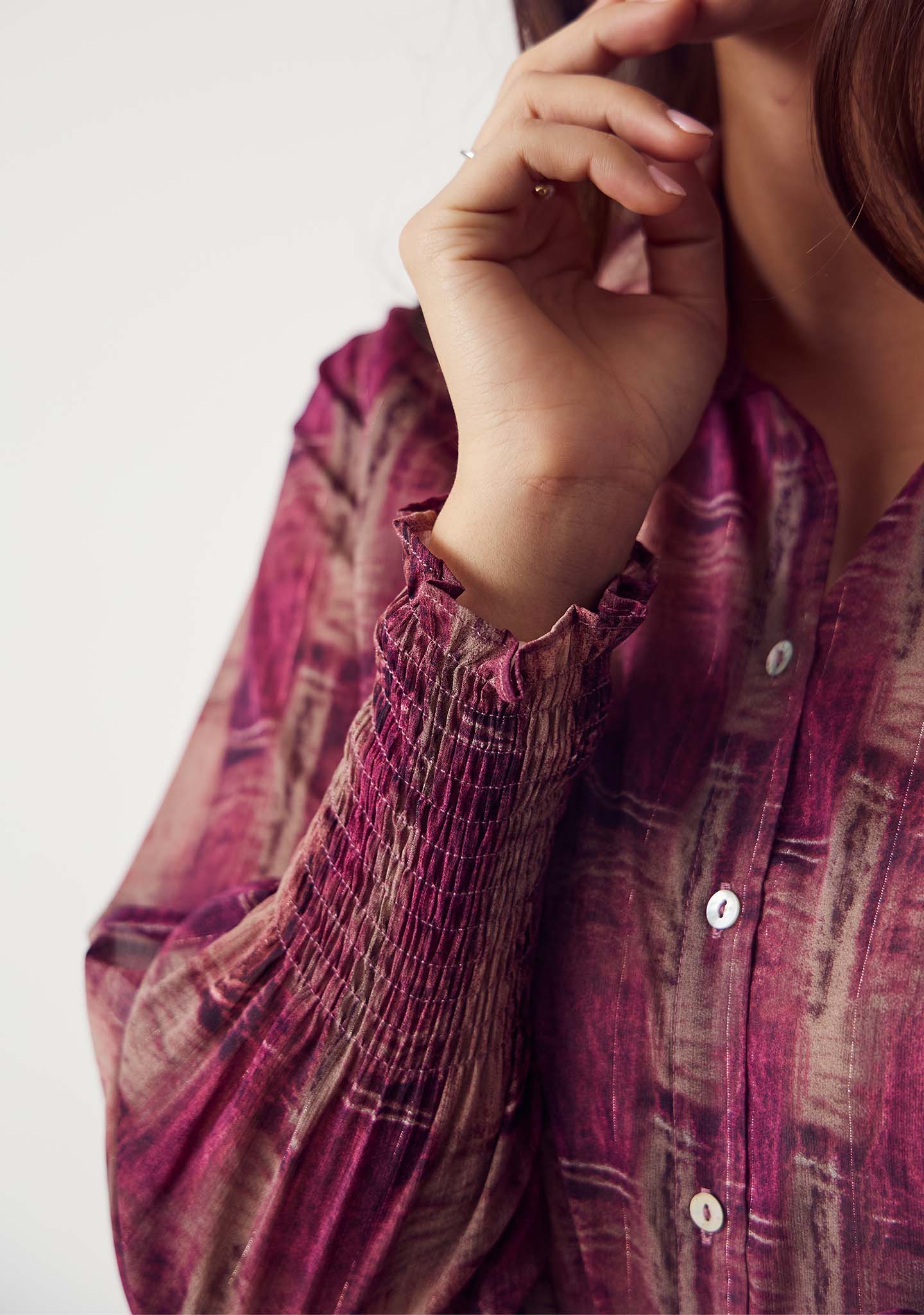 Vores elegante Vibse skjorte er alsidig og kan styles på mange måder. Denne skjorte er transparent i materialet og har en dejlig løs samt rummelig pasform. Den har en klassisk knaplukning med knapper hele vejen ned og en spids krave. Vibse skjorten har et flatterende print og de fineste smockdetaljer ved ærmeåbningen, som er med til at skabe et feminint look. Kan med fordel styles med et par bukser eller en smart nederdel. Og gerne med et par klassiske loafers for et fuldendt elegant look.