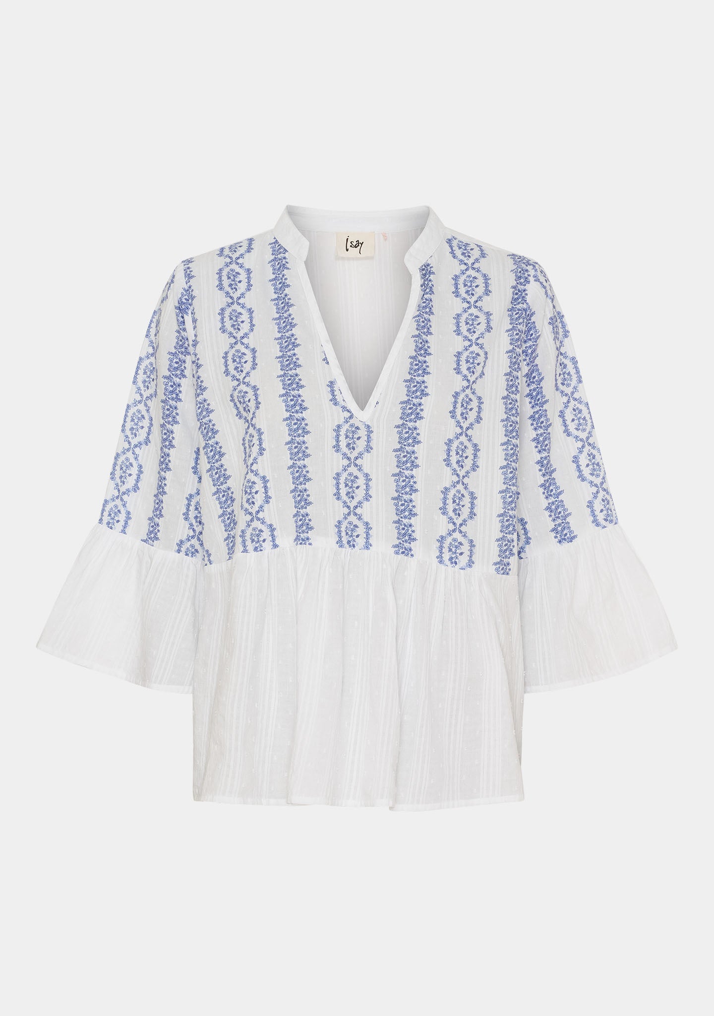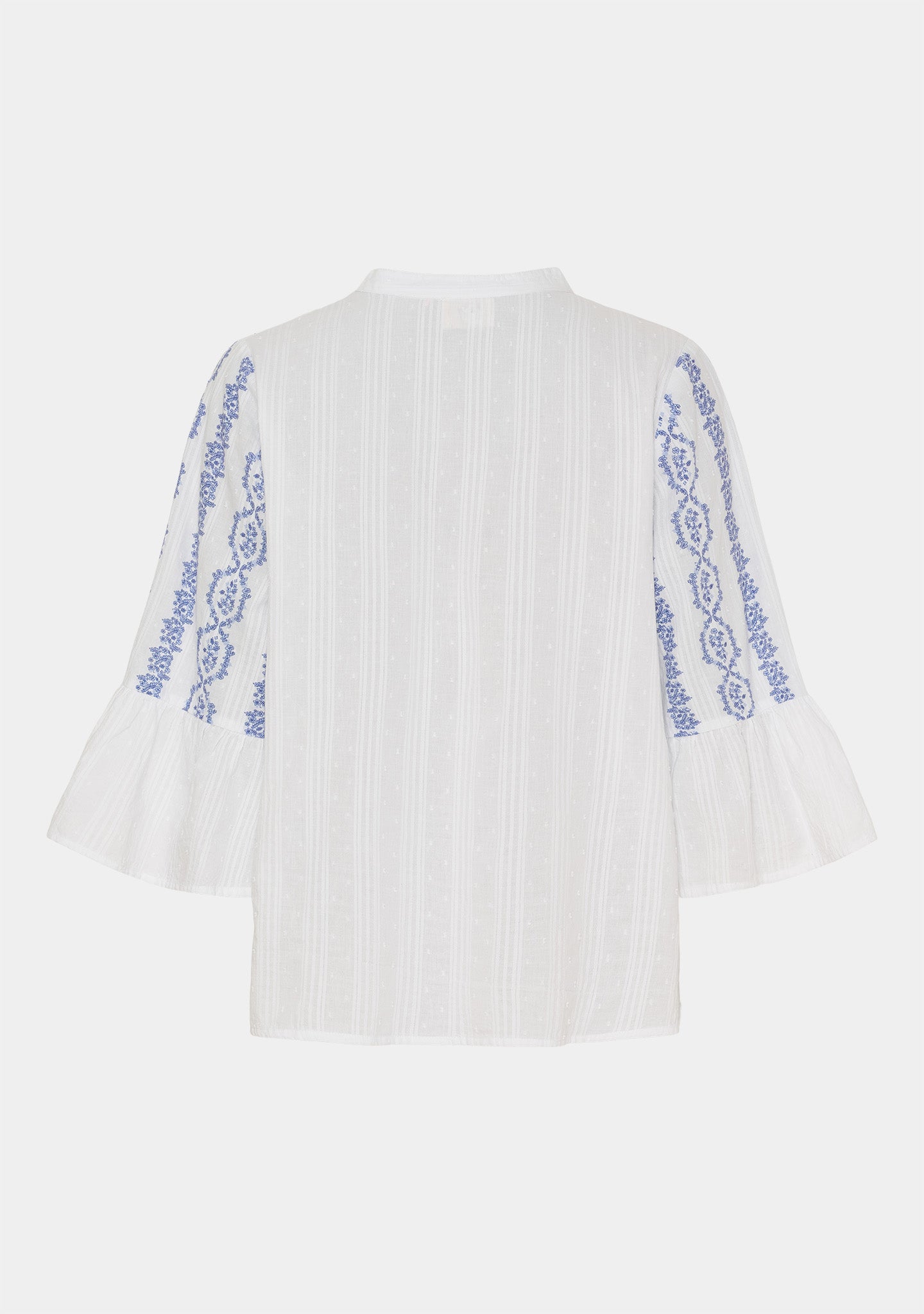 Mina Blouse har et let og sommerligt udtryk, der føles frisk med det samme. De blå broderede detaljer giver karakter og skaber et smukt spil mod den lyse bund.