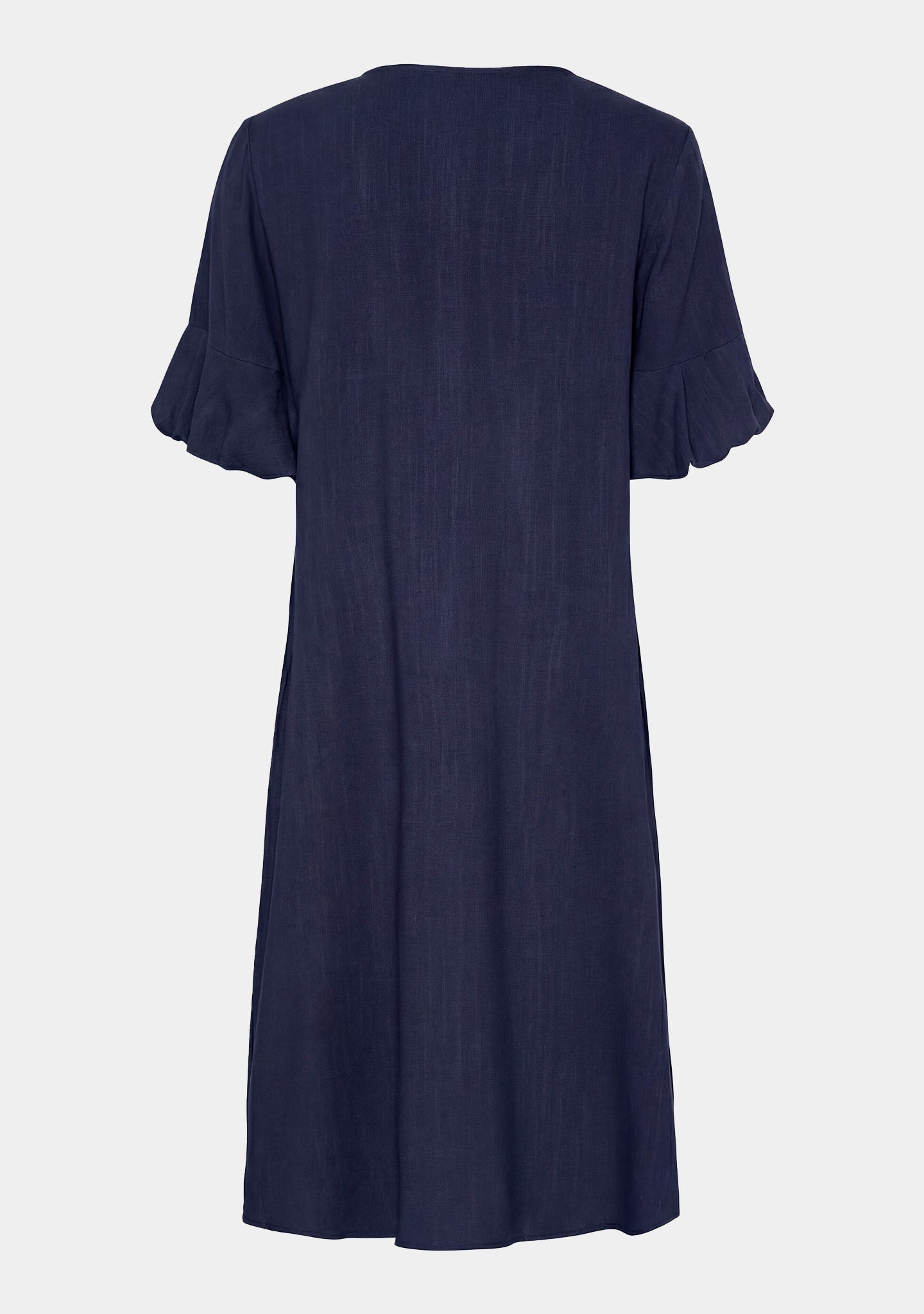 Ballonærmerne giver kjolen karakter. De har en blød volumen og stopper omkring albuen, hvilket skaber en fin balance mellem det afslappede og det mere elegante. Det er detaljen, der gør, at kjolen føles gennemtænkt – uden at være for meget.