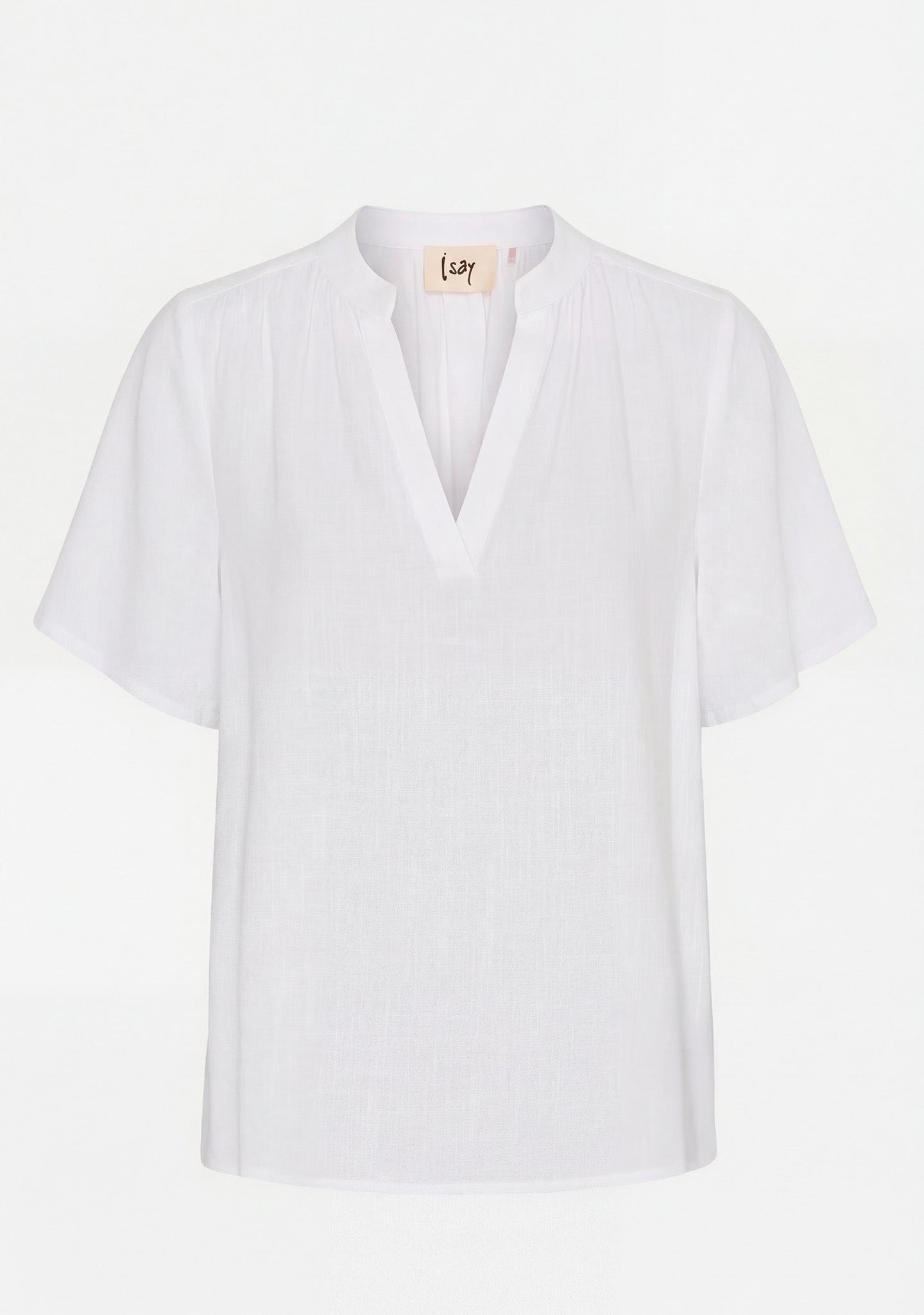 Den lille ståkrave og den åbne V-udskæring giver et rent og feminint look, mens de fine læg ved skuldrene tilfører en diskret detalje, der løfter helheden. Ærmerne har en let vidde, så de falder pænt og giver et afslappet, luftigt udtryk.