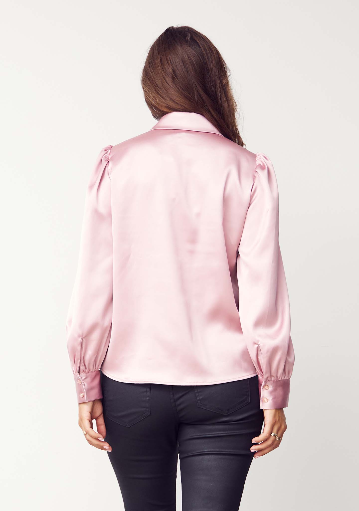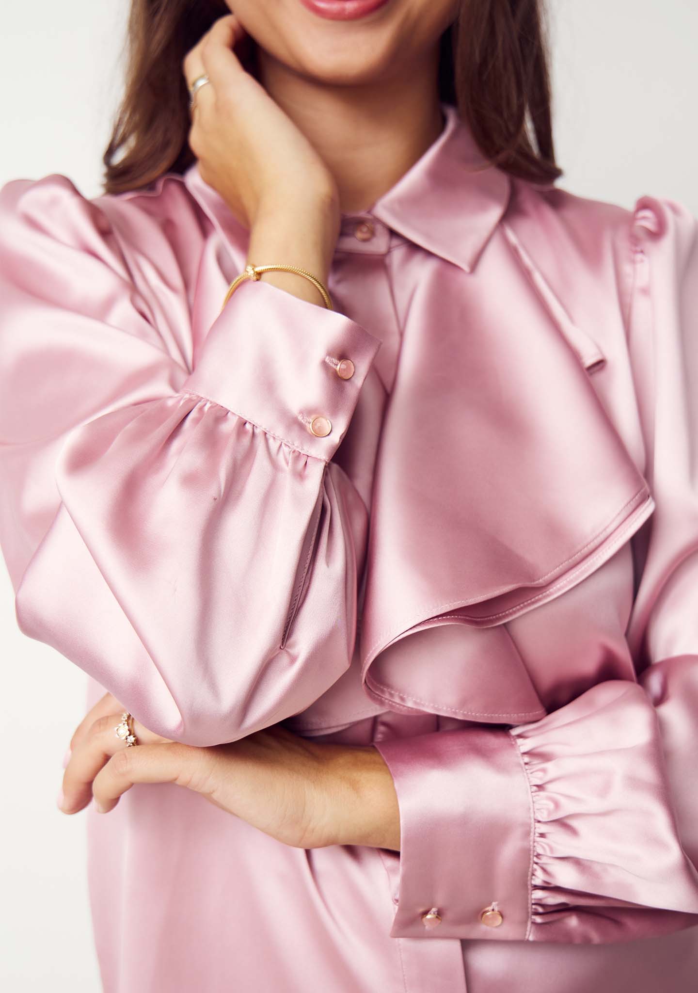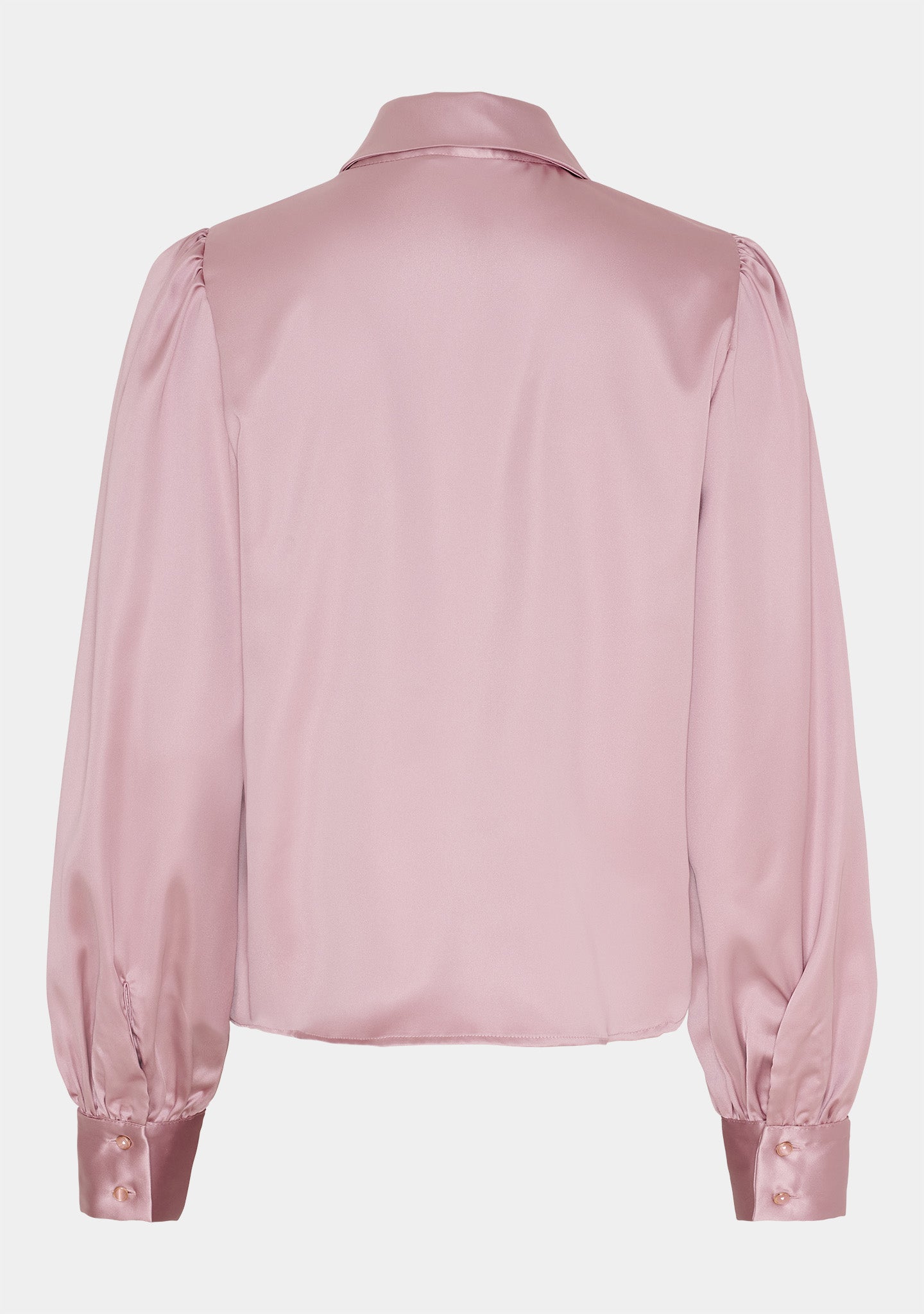 Den satinlignende kvalitet med en let glans giver skjorten et luksuriøst look og et smukt fald, mens tilsætningen af elastan gør den behagelig at have på hele dagen. De lange ærmer afsluttes med brede manchetter og knapper, der fuldender det stilrene design.