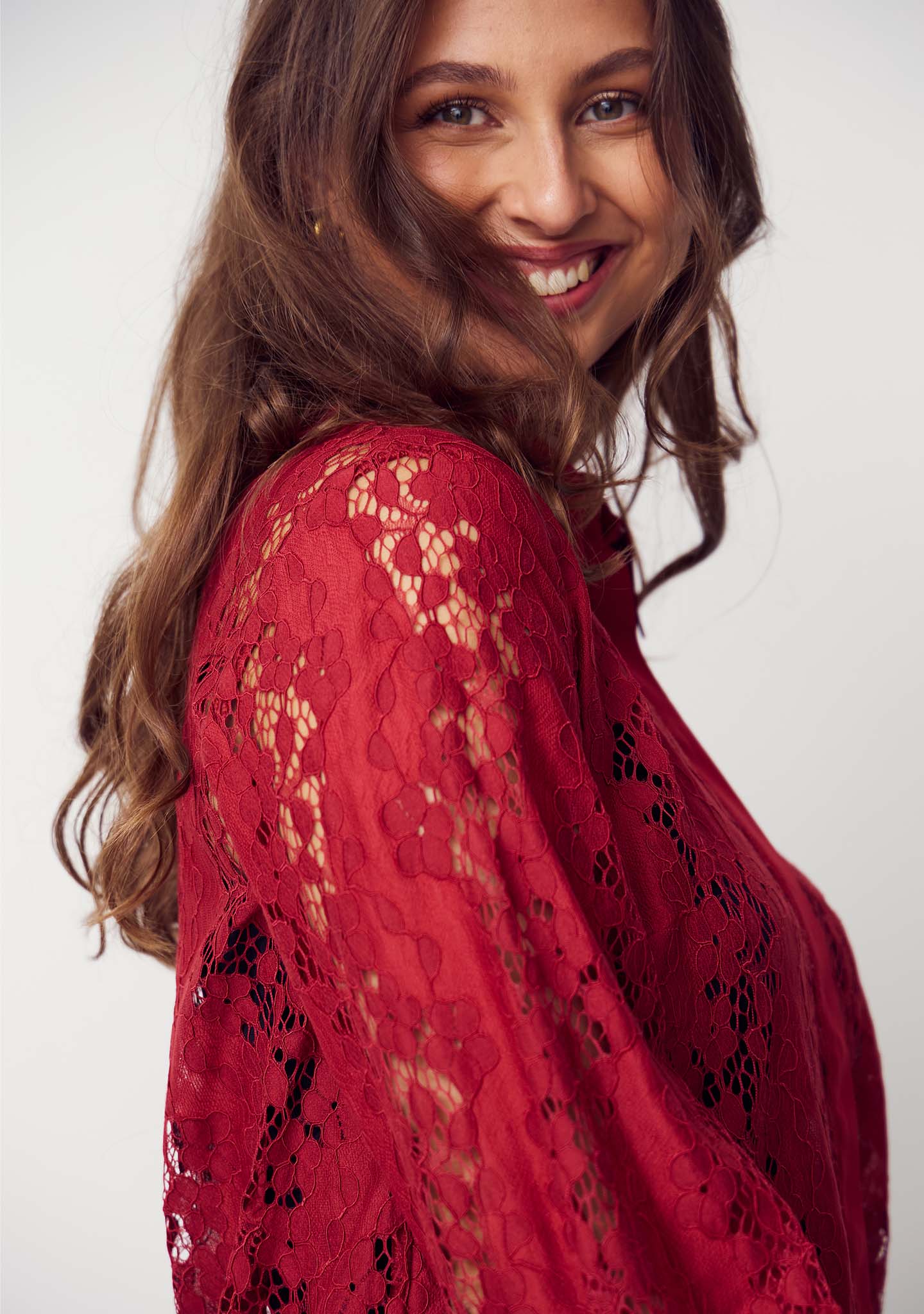 De lange ærmer er afsluttet med manchetter, som skaber et velklædt udtryk. Den lette bomulds- og polyamidblanding føles behagelig på huden og giver en luftig fornemmelse. Brug Kimie Lace Shirt med en top under for et mere dækket look eller med højtaljede bukser for en stilfuld kontrast.